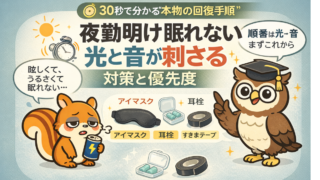 仮眠なし夜勤の後は神経が過敏になり、わずかな音でもイライラして目が冴えてしまいます。「耳栓+ホワイトノイズ」の最強コンボで対策します。