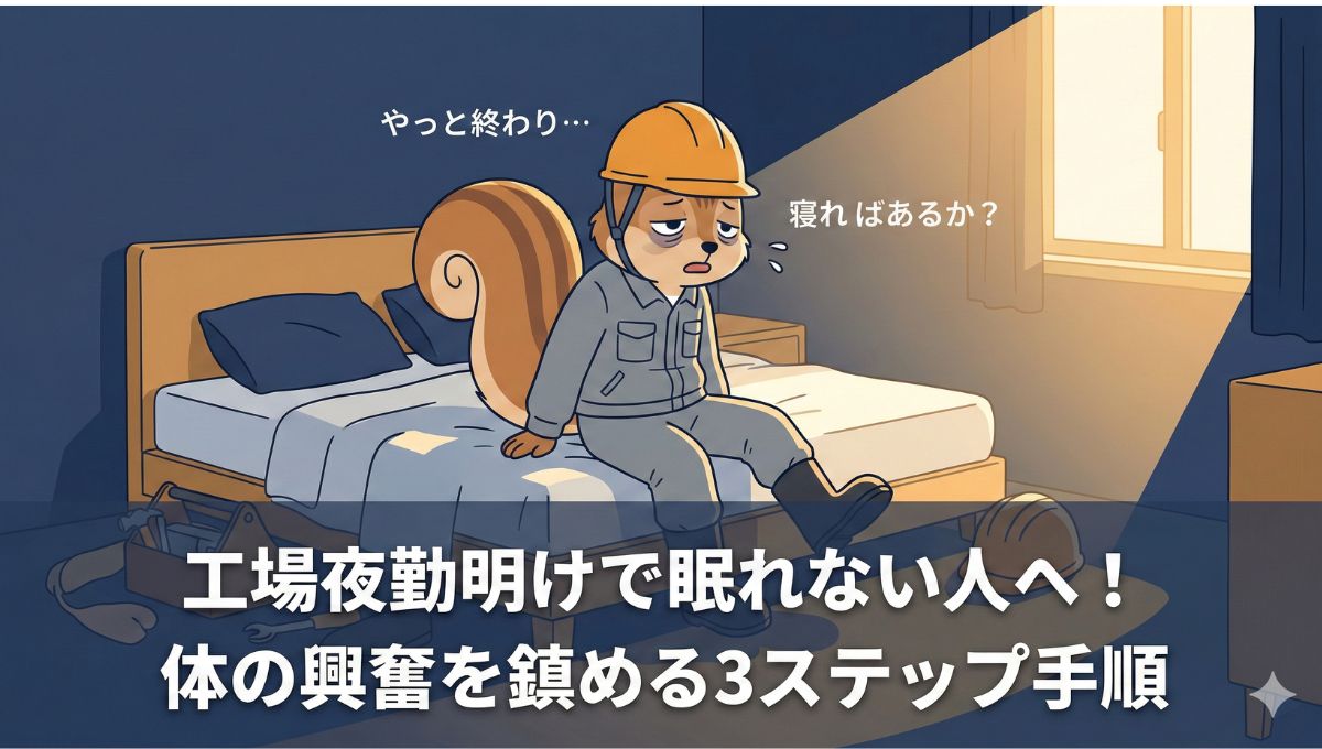 工場・製造業の夜勤明けは「騒音・振動・立ち仕事・強い照明」という4つの刺激が重なるため、他の職種と比べて体の興奮が落ち着きにくい傾向があります。帰宅後は「光の遮断→ぬるめのシャワー→軽い水分補給・耳栓セット」の3ステップで体をクールダウンさせることが、入眠への近道になります(個人差はあります)。