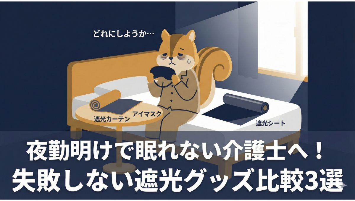 この記事では、遮光アイマスク・遮光カーテン・遮光シートの3種類を「どんな状況に向くか」「どこが弱点か」の視点で比較します。夜勤明けに昼間眠るための遮光対策として、何から始めれば失敗しにくいかを整理しました。