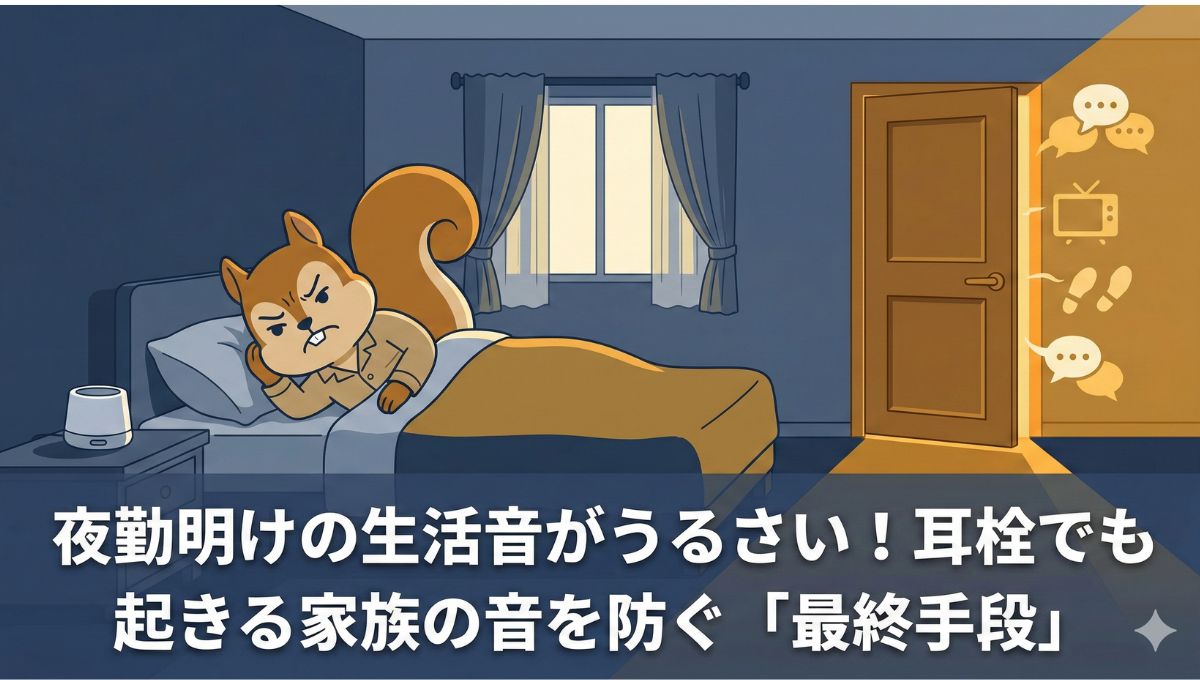 家族の生活音に対しては、耳栓だけ・ホワイトノイズだけではなく両方を組み合わせるのが現実的な解決策です。耳栓で高周波の声・テレビ音を軽減しつつ、ホワイトノイズで突発的な音の変化を目立たなくする——この二重の対策で、夜勤明けの睡眠環境は大きく改善できる可能性があります。