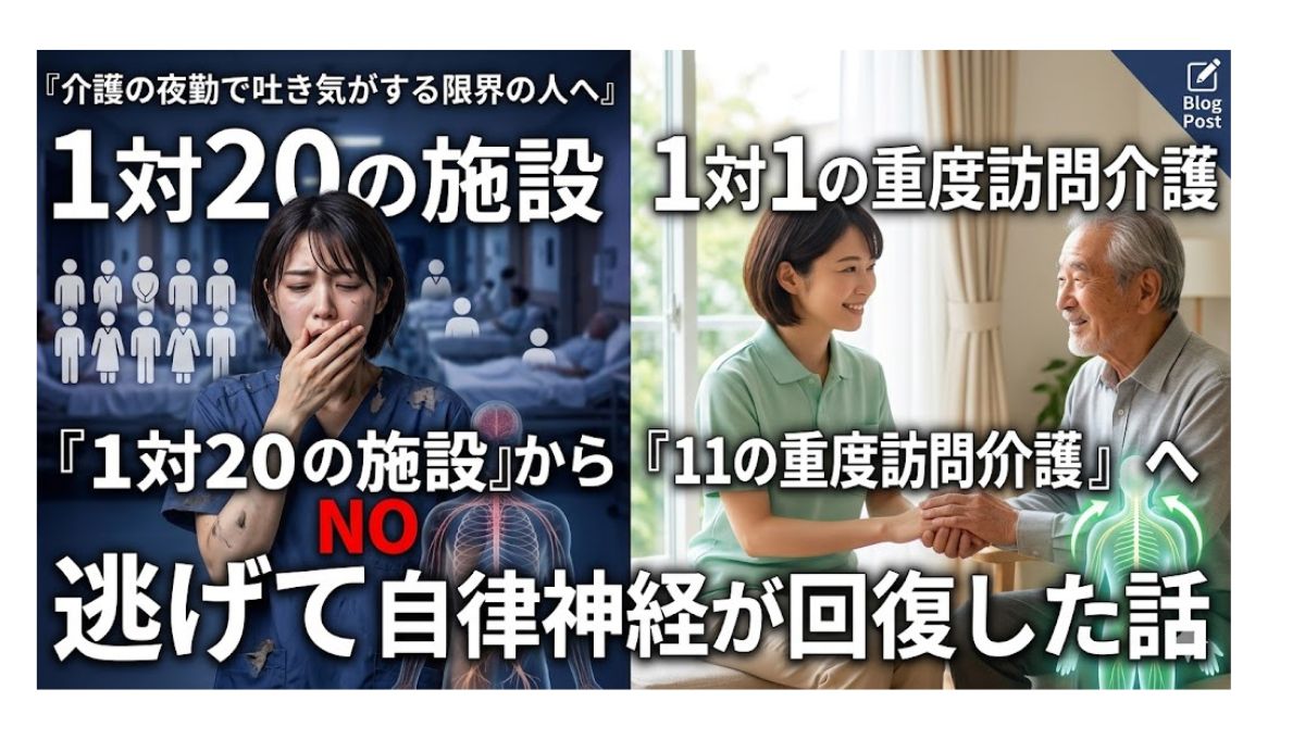 僕は介護福祉士として、特養での「1対20」の夜勤を経験し、心身を壊しかけた。そこから逃げ出して今は「重度訪問介護(1対1)」で働いている。12時間労働は、同じなのに、身体の消耗がまるで違う。この記事では、その話をする。